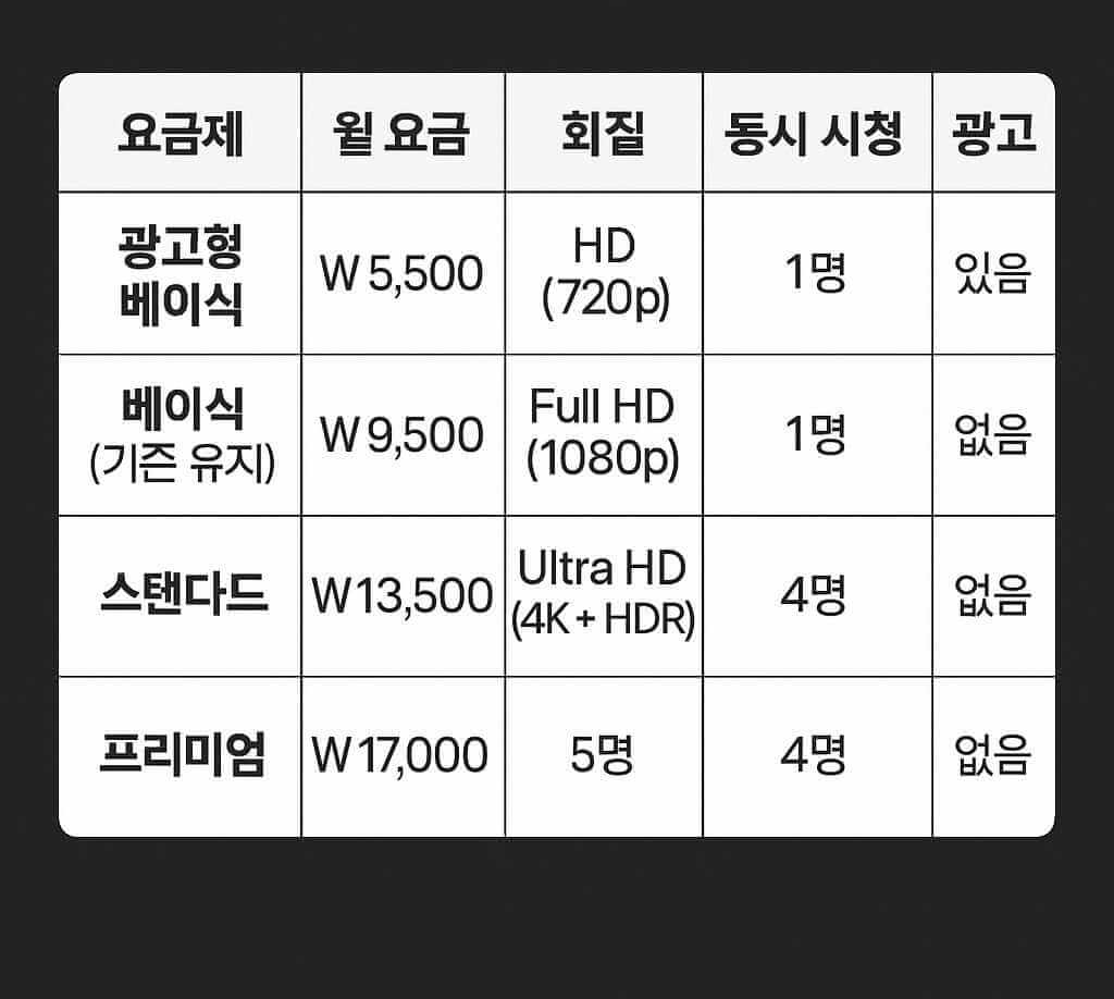 💡 요약: 광고형은 저렴한 요금이 강점이며, 스탠다드 및 프리미엄은 고화질 및 동시 시청에 유리합니다. 사용자 환경과 이용 패턴에 맞는 선택이 중요합니다.